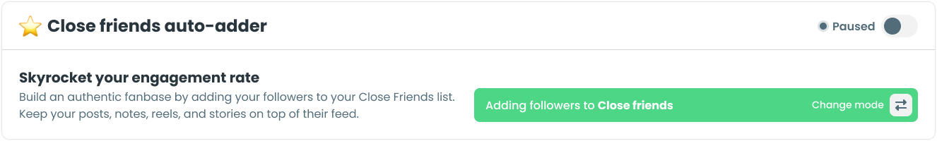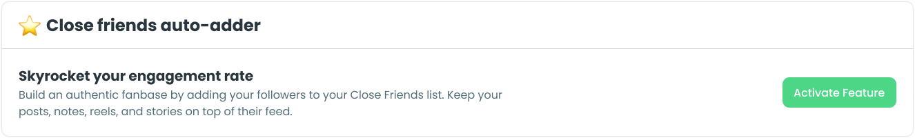 Once you activate the feature inside the dashboard, your followers start getting added to your Close Friends list automatically. New or old, every single one, up to 1,000 followers a day. The system keeps it steady and organic so your activity stays under Instagram’s radar and your followers experience it naturally.